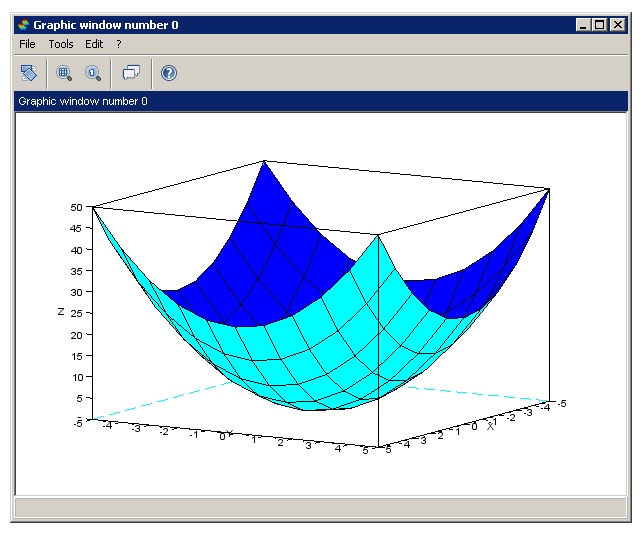 It turns out that generating a 3D plot was rather tricky. After installing SciLab (which was a breeze), I launched the SciLab shell/window to get to the –> SciLab prompt. Here’s how I created the 3D plot for the function f(x,y) = x^2 + y^2 shown below.