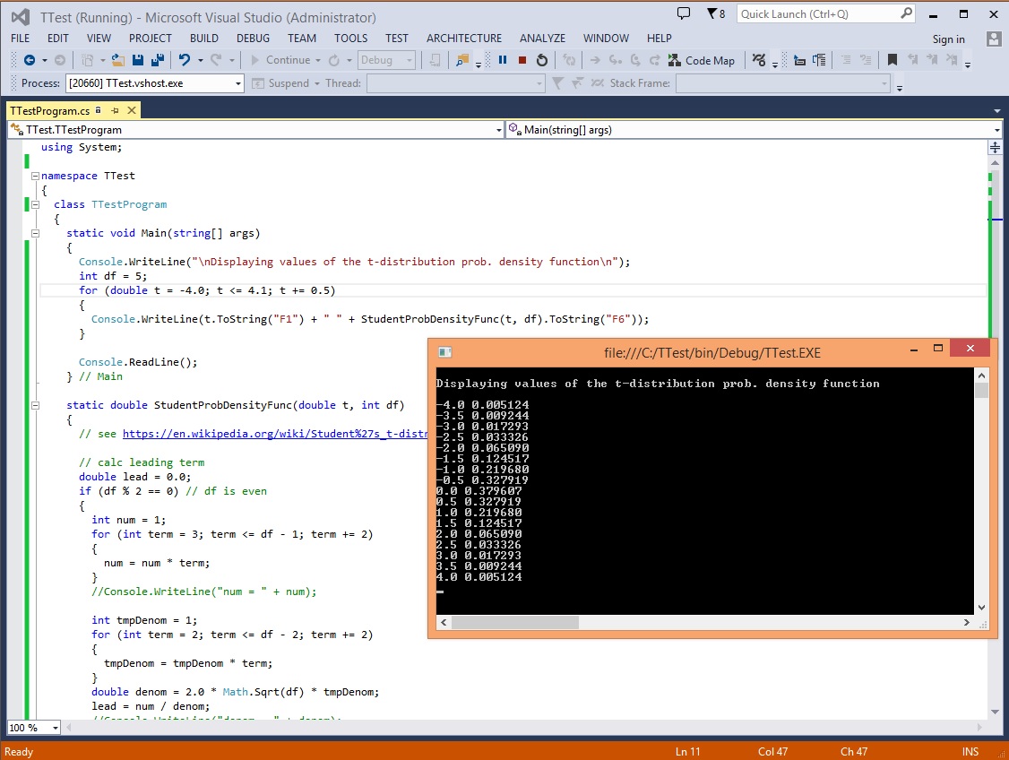 Just for fun I thought I’d generate a graph of the t-distribution. The Wikipedia article on the t-distribution gave me the equation for the density function. The equation is kind of wacky and involves the Gamma function (which looks like a capital ‘T’ with the left part of the top crossbar missing). Luckily, the complicated part of the t-distribution equation that involves Gamma can be computed relatively easily.