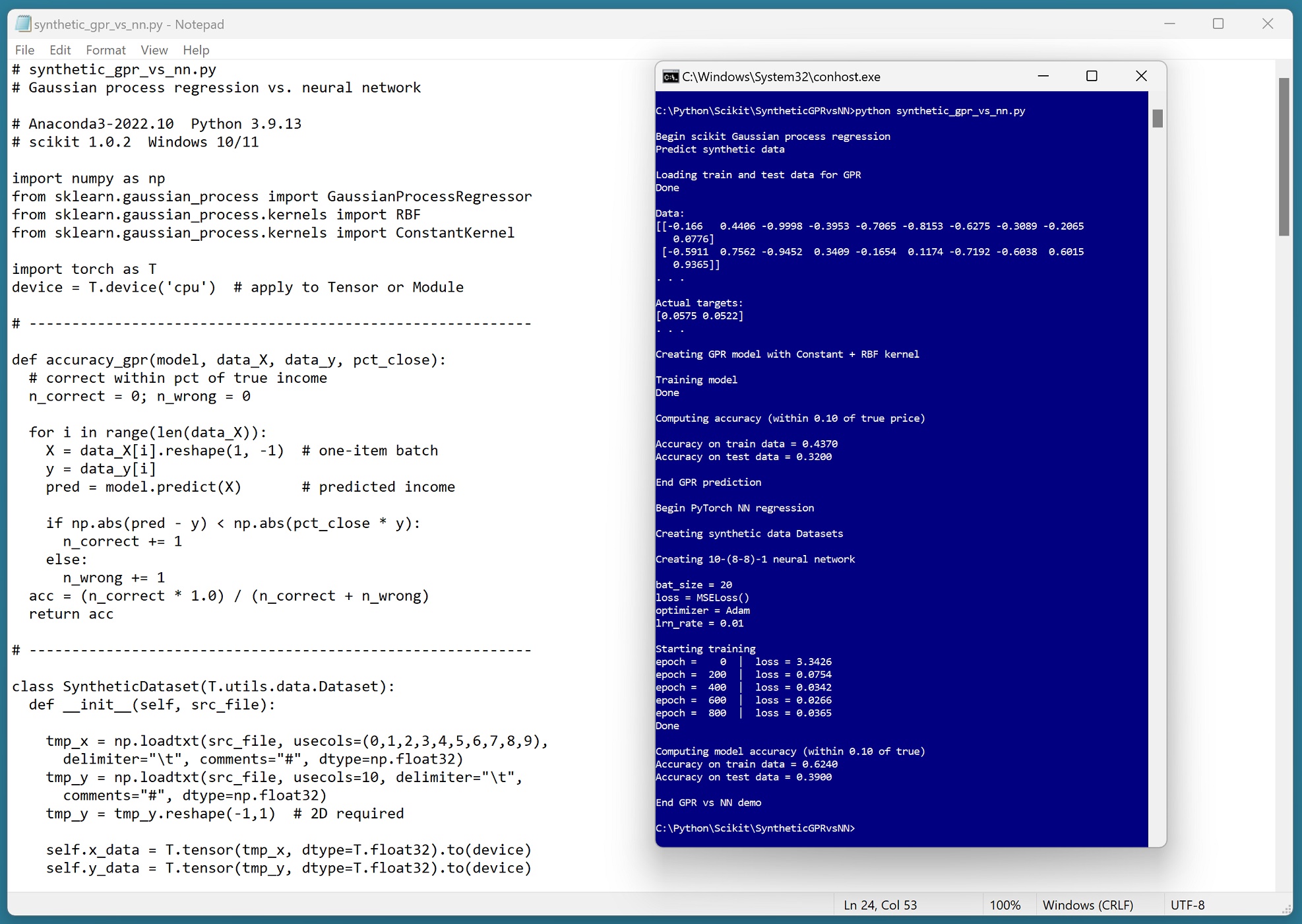 I generated synthetic data with 10 predictor variables (and one target value to predict). Each predictor value is between -1.0 and +1.0 to simulate divide-by-k normalization. Each target value is between 0.0 and 1.0. I made 1000 training items and 200 test items. I used a neural network to generate the synthetic data but none of the generator information was used for the NN prediction model, so the NN models had no advantage over the GPR models. The point is that there is an underlying latent model that is discoverable in theory by either technique.