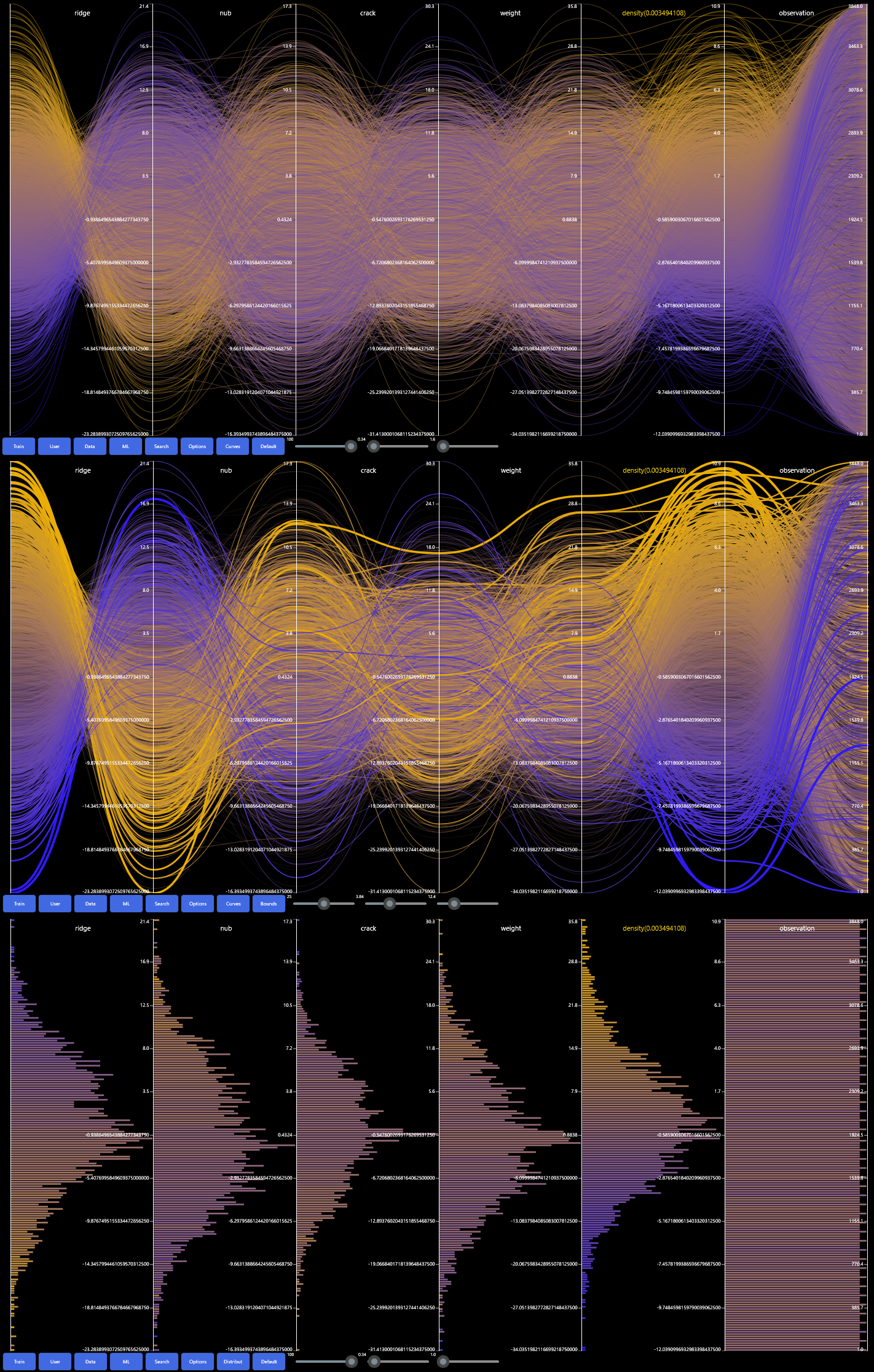 The first image shows the default parallel coordinates based on the density of the Pollen dataset. The second image highlights the borders. The last image shows the default data distribution.