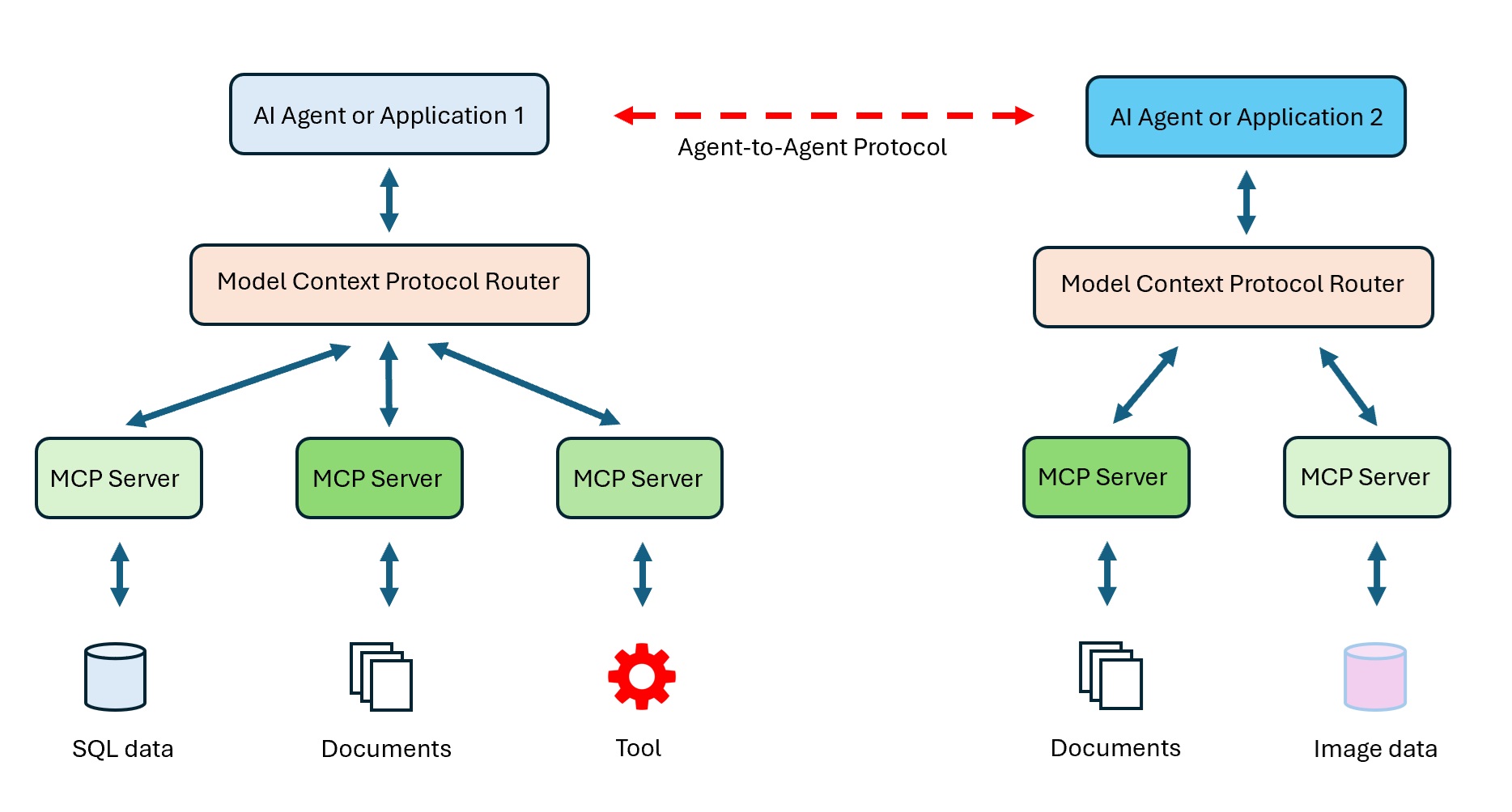In the diagram, AI Application 1 could be something like a ChatGPT (from Open AI) system. The application needs data from a SQL database, a document store, and some sort of custom processing tool. AI application 2 could be something like a Llama agent (from Meta) that needs to access some documents and a database of images.